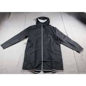 New Rains Raincoat Long Jacket Hood Womens XL Black Reflective Trim