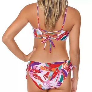 Dive into summer with this vibrant tropical print bikini top. Featuring a mix of red, purple, and green hues, this swimwear is perfect for making a splash. Enjoy comfort and style at the beach or pool.