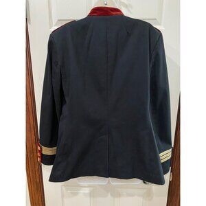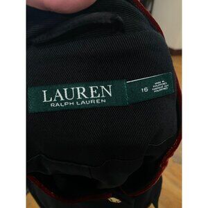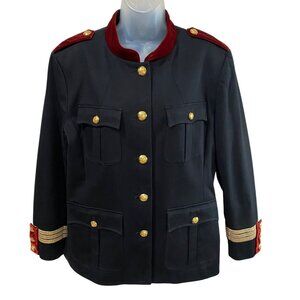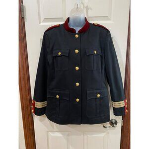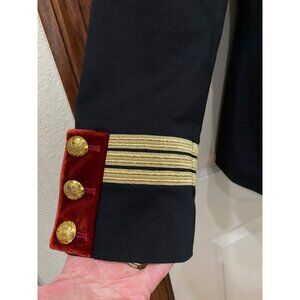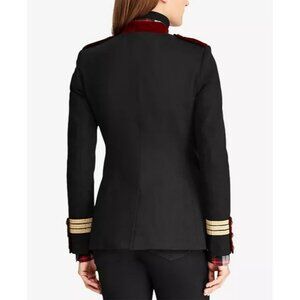 This stylish Ralph Lauren jacket combines a structured military design with luxurious red velvet accents and gold-tone buttons, making it a standout piece.