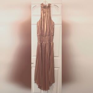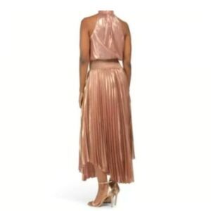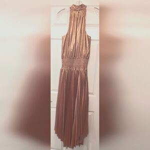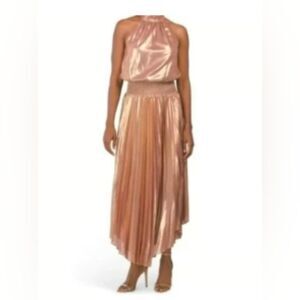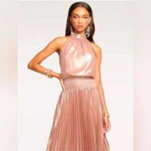 New Ramy Brook Olana Dress Pleated Metallic Blush Pink shimmer maxi formal sleeveless size 6. The Ramy Brook Olana Dress is a sweeping midi dress with a high neck, smocked waist, and elegant pleated skirt. It is made with a pleated lame fabrication that enhances the silhouette.
