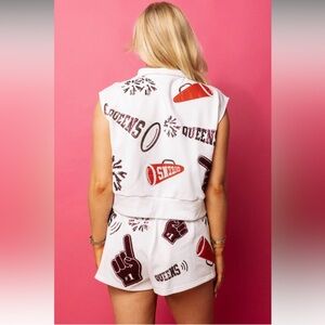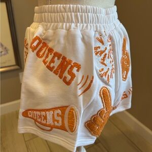 This QUEEN OF SPARKLES top and shorts set combines a chic white base with striking white and orange sequin accents, creating an eye-catching look. Rare Set. Brand New! Comfortable fit. Top has stylish white Cheers Queen Icon and Pom Pom’s 📣 and is sleeveless. Top buttons down with orange snap buttons and includes matching elastic waist shorts. Shorts have pockets.