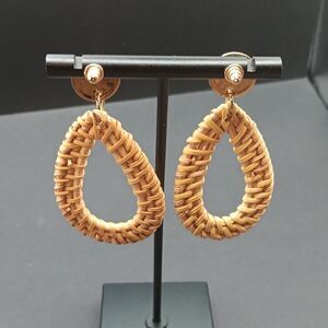 New Ratten Straw Wicker Braided Drop Dangle Lightweight Statement Earrings. Light Brown And Gold Tone Oval Post Design.