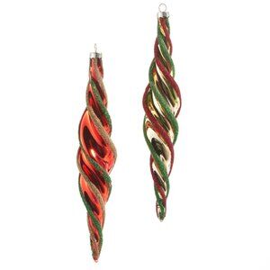 This stunning ornament is sure to turn heads on your tree this holiday! Each one is made of swirled glass with glitter stripes swirling around the ornament! Each sold individually. Made by Raz Imports. Made of glass. Dimensions: 2"D X 9.5"H.