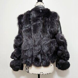 New Real Fox Fur Lamb Leather Jacket Blazer Dark Grey Charcoal Black No Mink