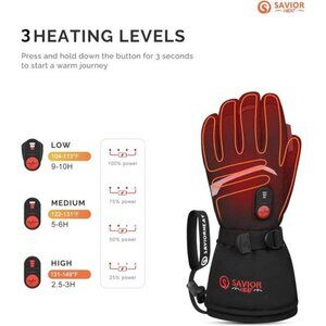 🧿【Electric Heating Gloves】Savior heated gloves fast heat in 10s with 3 heat levels(Low/Medium/High) up to 150°F(65.5°C) on High. Built for below-freezing temps—no preheat, no waiting—so cold hands warm fast and stay comfortable. One-touch control makes it easy to dial in comfort for skiing, snowboarding, snowboard parks, skating, commutes, winter work outdoors.
