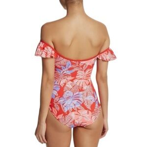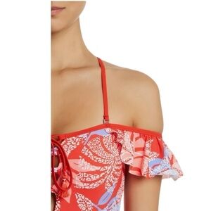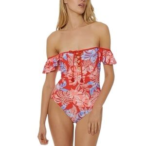 New! Red Carter Lace-Up Ruffle Off-the-Shoulder One-Piece Swim