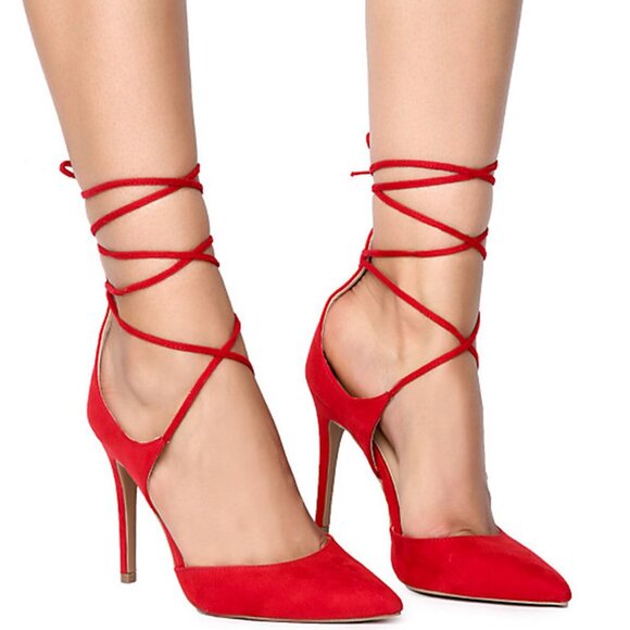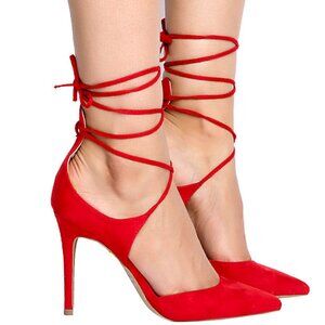 New Red Pointed Toe Strappy Lace-Up Stiletto High Heel Pump Faux Suede size 7.5