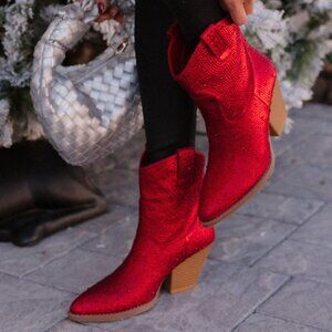 New Red Rhinestone Cowgirl Cowboy Western Ankle Boots Booties Block Heel Pull-On