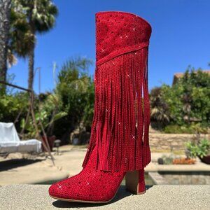 New Red Rhinestone Crystal Fringe Western Cowboy/Cowgirl Boot Knee High Heel Zip