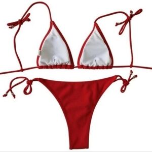 New Red Ribbed Tie Shoulder Tie Side Triangle Bikini Set Swimsuit Size XL