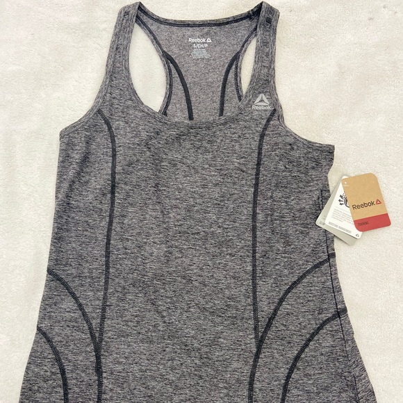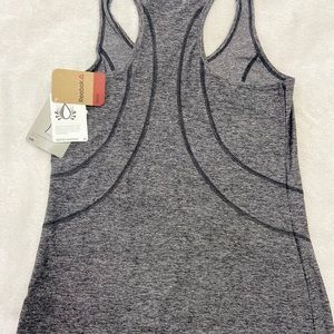 New Racerback tank top. Moisture wicking technology gray with black detail