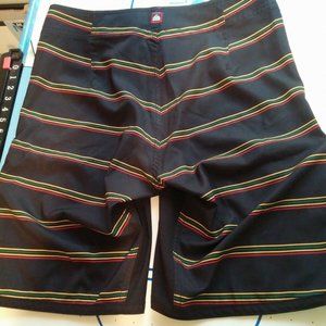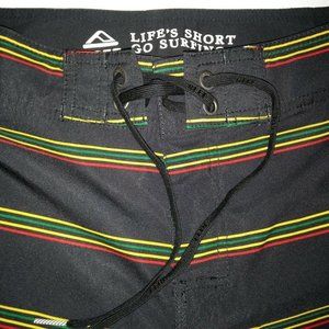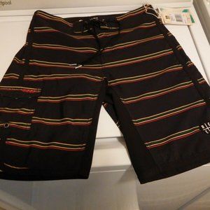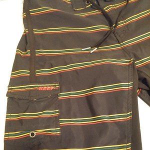 New with Tags Reef Authentic Cargo River Jett Striped Board Shorts. Men's size 30. Black shorts with Yellow, Red, and Green Stripes.