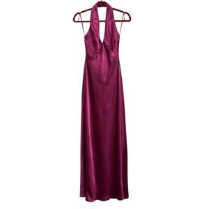 Reformation Daniela Silk Dress in Hibiscus Tea. Women's Size 10 / Large. Features halter neck, open back backless, long maxi length, fitted bodice, relaxed skirt, plunging deep v-neck, lightweight silk charmeuse fabric. 100% silk. Never worn, never altered. Brand new with tags. Retail $398.