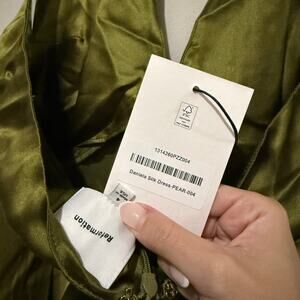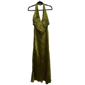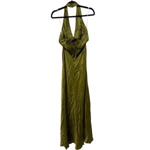 Reformation Daniela Silk Dress in Pear. Women's Size 4 / Small. Features halter neck, open back backless, dark olive green color, long maxi length, fitted bodice, relaxed skirt, plunging deep v-neck, lightweight silk charmeuse fabric. 100% silk. Never worn, never altered. Brand new with tags. Retail $398.