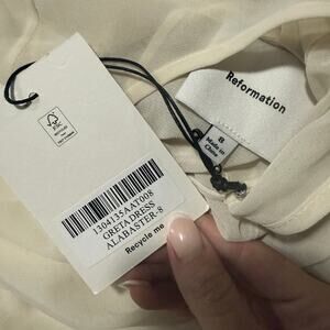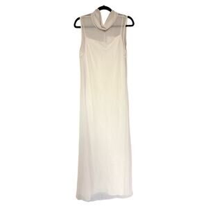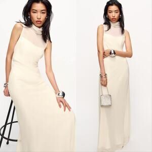Reformation Greta Dress in Alabaster. Women's Size 8 / Medium. Feature mock neck, long maxi length, sleeveless, slim fit, sheer dress overlaying satin slip dress, deadstock fabric. 100% polyester. One of slip connectors broke from a try on, but dress is not affected. Never worn, never altered. Brand new with tags. Retail $798.