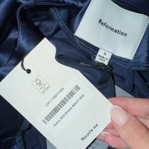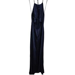 Reformation Jeany Silk Maxi Dress in Navy Blue. Women's Size S / Small. Features lightweight silk charmeuse fabric, adjustable straps, open back and tie detailing, sleeveless, halter neckline, center back buttons, fitted bodice, long full length maxi skirt, unlined. 100% silk. New with tags. Retail $348.