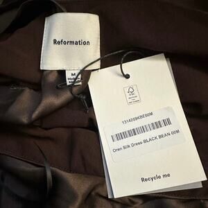 Reformation Oren Silk Dress in Black Bean. Women's Size M / Medium. Features lightweight charmeuse fabric, strapless, elastic band at the top, sleeveless, straight neckline, an a line silhouette, and separate matching scarf. relaxed fit throughout, lined, long length. 100% silk. Never worn, never altered. Brand new with tags.