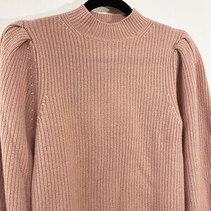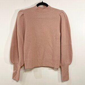 Reformation Perche pullover sweater featuring a mock neck, puff sleeves with gathered shoulders and elongated cuffs, and a mid to heavyweight 100% cashmere yarn in a pretty shade of muted beigey pink