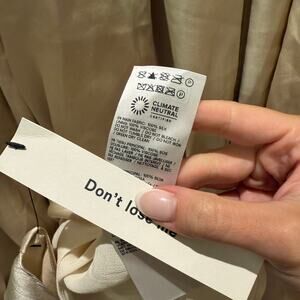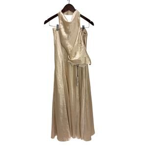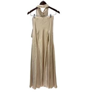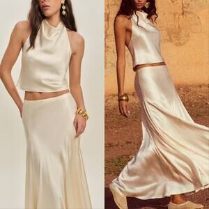 Reformation Sera Silk Two Piece Set in Almond. Women's Size 2 / Extra Small. Features a line floor length long maxi skirt, mid to low rise, draped high mock neck, backless open back, sleeveless, lightweight silk charmeuse fabric. 100% silk. Never worn, never altered. Brand new with tags. Retail $498.