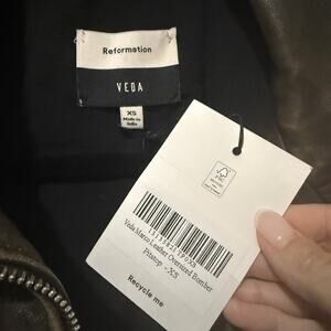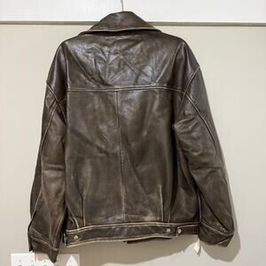 Reformation Veda Marco Leather Oversized Bomber in Pit Stop Brown. Women's Size XS / Extra Small. Features collared neck, full front zip closure, front pockets, chest zip pocket, long sleeves, soft flexible leather, lined, snap button cuffs, oversized slouchy fit, intentional one of a kind distressing. 100% leather. Brand new with tags. Retail $658.