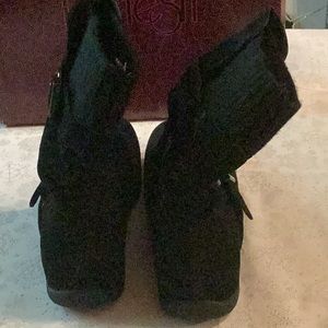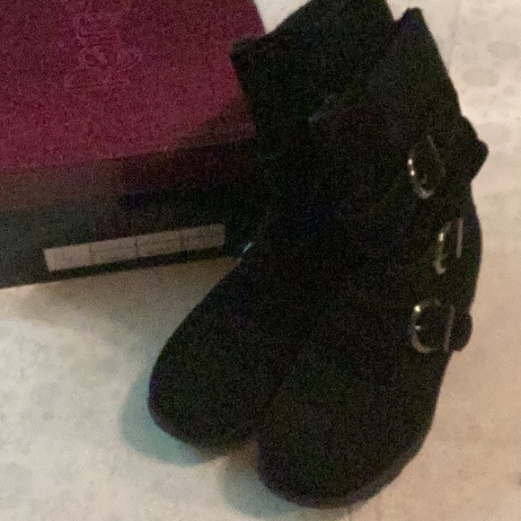 New in the box Elma boot. 4.5” zipper on insides of boots. Approximately 9” tall. All man made materials,faux suede. 2” knit cuff. Never been worn. Size 7.