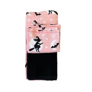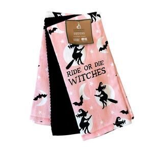 Add a touch of glam to your space with this brand-new 3-pack of Deborah Connolly The new release Deborah Connolly "Ride or Die Witches" Kitchen Towel Set is a festive and stylish addition to your kitchen decor. Made from 100% cotton, this set includes three kitchen towels featuring a pink and black color scheme with a fun witch theme, perfect for Halloween. The towels are designed with a witch pattern, making them a unique and eye-catching choice for your kitchen. Add a touch of magic to your kitchen with this cute and functional towel set from Deborah Connolly.