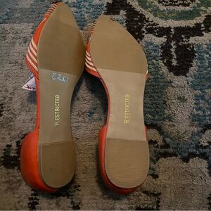 These vibrant orange and gold flats from Restricted offer a perfect blend of style and comfort. With a classic loafer design, they feature a sleek, rounded toe and a flat sole, making them ideal for everyday wear. The striking color combination ensures they stand out as a fashionable accessory for any casual outfit.