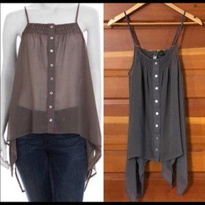 Brand new, never worn, no tags. Purchased from Revolve from the brand Wilster. Dainty cami strap ruched front button down sheer gauzy flowy cami blouse. Purchased for vacation in Hawaii to wear as a coverup top. Classy mother of pearl buttons down the front. Very minimalistic shape, flattering on all body types. Adjustable thin straps. Handkerchief hem. Size S. Box BB.