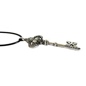 This new elegant key-shaped pendant showcases intricate detailing with shimmering rhinestones on a silver-tone finish. Hung on a durable black cord, it offers a timeless accessory for professional or formal settings.