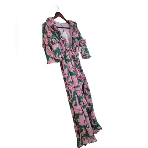 New With Tags Rhode Pink And Green Floral Boho Ruffle Wrap Waist Maxi Dress . Length 51 in Pit to Pit 18 in .
