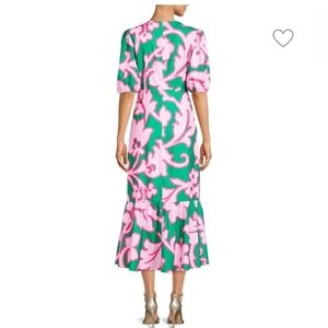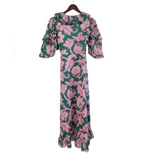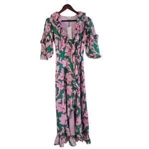 New Rhode Green Pink Floral Boho Wrap Waist Ruffle Midi Dress Size Medium