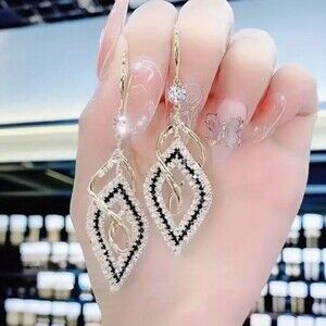These beautifully intwined earrings are so classy and stylish. They dangle and the sparkle is amazing. Gorgeous gold plating with zircon studs. Hook dangle for comfort and at just under 2.5" long and less that .75" wide. Too pretty.