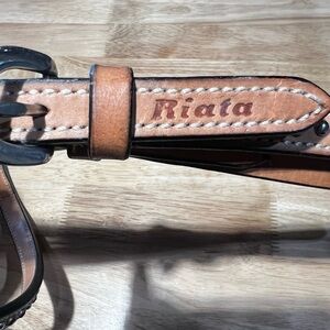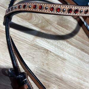 New never on a horse Riata horse sized headstall. Has red stones and silver grommets.