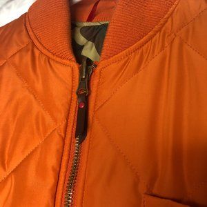 New Robert Graham Reversible Puffer Jacket Orange and Camo Long sleeves with contrast knit cuff Standing knit collar Two pocets on front/hip area and one chest pocket NEW WITHOUT TAGS Retails for: $498!!! Color: Orange on one side and camo on the other side. Approx. flat lay measure as see in pictures. Second to last picture of tags of item (not included) Last picture shows small spot on back. See pictures for additional details. If you like any of my other items please like and bundle them together for an even better deal! M-F16 S-F17