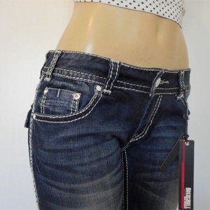 Dark Blue Denim Color has Factory Fading, Boot Cut Leg Fit, Low Rise Button Zip Fly Waist, Heavy Stitch Seams, 5 Pocket, Embroidered Flap Back Pockets with Rhinestone Embellishments, Some Stretch, 98% Cotton 2% Spandex Material,