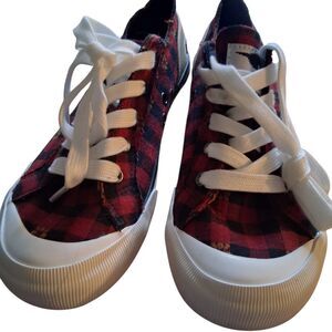 Rocket Dog Jazzin Plaid Black & Red Women's Sneakers Size 8.5 are new without tags. Bright color plaid with classic white toe cap, these are retro style, casual lace up low tops. Lining and footbed both are cotton with plush foam comfort insole. These shoes are new without box.