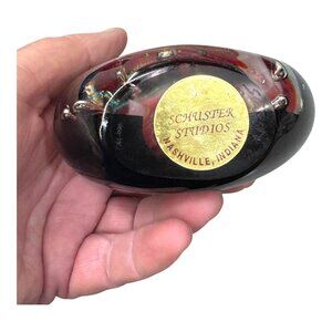 Elevate your space with this exquisite Schuster Studios glass sculpture. Hand-blown with vibrant red and gold iridescence, it’s a stunning decorative piece.