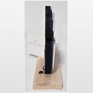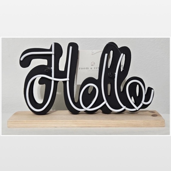 NWT room & retreat black painted wood & white metal Hello shelf sitter tabletop on a nude wood plank. Perfect for mantle, office, desktop, dorm room, or anywhere you can set it!