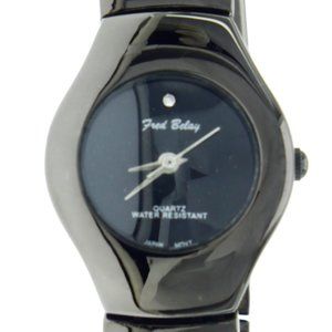 NEW Women's FRED BELAY Quartz Watch, Shiny Black Band and Case and Dial, Metal Band, Water Resistant, Analog.