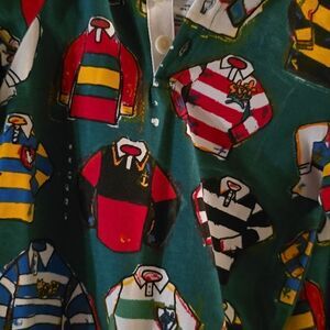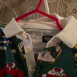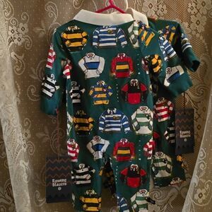 One piece 2 infant jumpsuit size 3-6 months, red blue yellow green white black Rugby and polo shirts on green background. Long sleeve, white collar, snap leg.