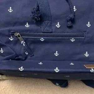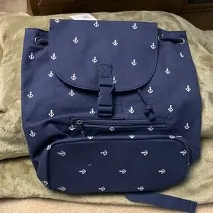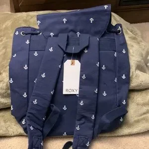 New with tags Roxy drawstring latching backpack in blue anchor print.