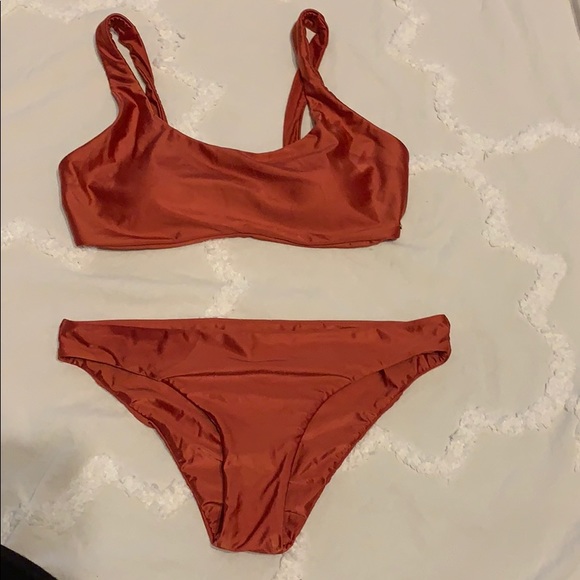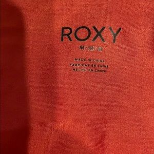 New Roxy two piece, orange red in color. Beautiful soft and shiny material. Extremely soft to the touch. Worn once and in brand new condition