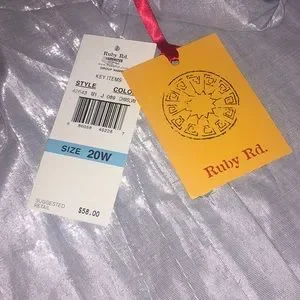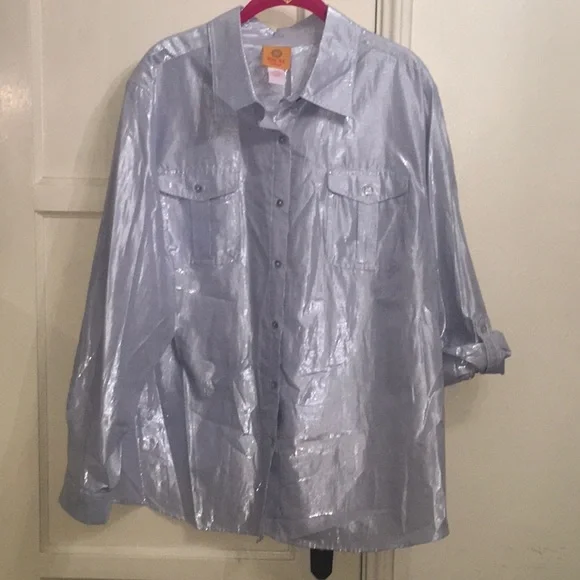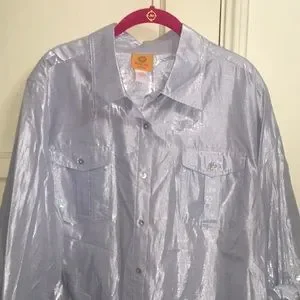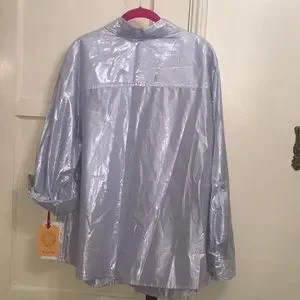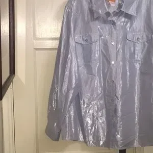 New with tags top. Approximately 29” in length & 26” across bust area, two front pockets, shimmering fabric and button front closure. Sleeveless measure approximately 23” in length.(1A)