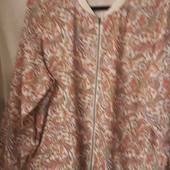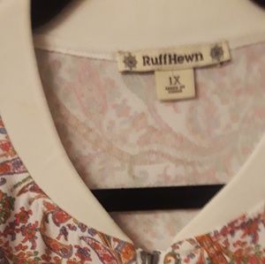 New 1X Ruff Hewn Jacket without tags. Front zip, paisley print with a cream color collar and band around the waist. Never been worn. I also have a matching peasant top posted if interested, also new.