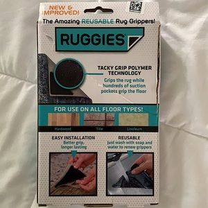 New in box Ruggies Reusable rug grippers. There are 8 rug grippers in this box. Box does have a rip but these weren’t opened.