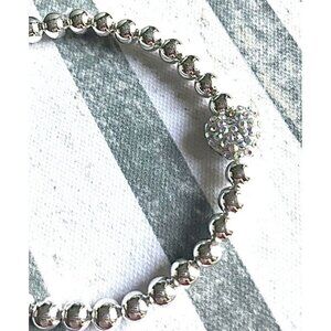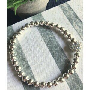 This fun and stylish beaded bracelet features ONE iridescent fairy dust Austrian crystal encrusted puffy heart as a focal in the front. The heart is 12mm across. The bracelet also has round lightweight silver tone metal beads that are 6mm size. The bracelet is adjustable with jeweler's grade elastic. It is adult size and measures 8".