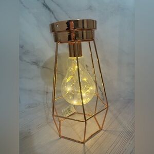 This lamp combines a sleek, modern design with a touch of industrial charm. It features a rose gold geometric wireframe base that elegantly encases a transparent bulb filled with delicate, glowing fairy lights. The warm LED light creates a soft and inviting ambiance, making it perfect as a decorative piece for bedrooms, living spaces, or work desks. The compact size and minimalist style allow it to complement various interior themes while serving as a conversation starter.