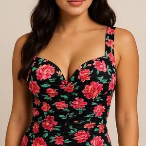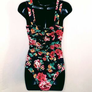 New S Floral Ruched Deep V Neck Wired Bodysuit Black 90's Retro
