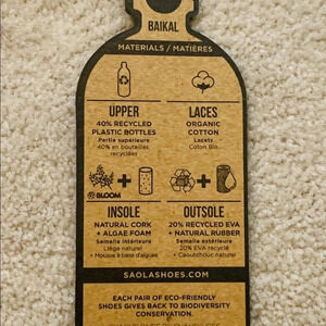 Saola's Baikal sneakers, featuring materials from recycled plastic bottles, a cushy cork and algae foam footbed, and a recycled EVA and natural rubber outsole.