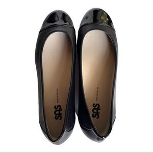NWOT SAS Scenic Ballet Flat in black premium patent leather, relaxed fit with rounded shiny toe and plush comfort built in. A removable footbed is easy to wash and adds cushion. Flex Strips keep this shoe light and flexible. A shock-absorbing sole allows for all-day comfort.
